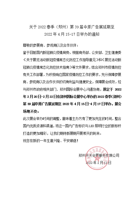 根據(jù)近期國內(nèi)新冠肺炎疫情形勢,為積極響應國家疫情防控工作的要求,充分保障參展商、參觀商以及合作伙伴的切身利益與健康安全,鄭州天天會展服務有限公司將原定于今年2月20-22日舉辦的2022春季(鄭州)第39屆中原廣告展延期至4月15 -17日進行,展會原定場地不變。